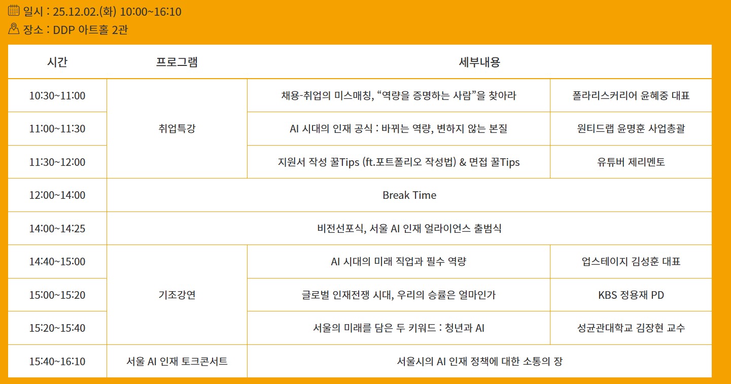 취업특강, 비전선포식, 서울 AI 인재 얼라이언스 출범식, 기조강연, 서울 AI 인재 토크콘서트, HR컨퍼런스, 서울시 AI 인재 해커톤,